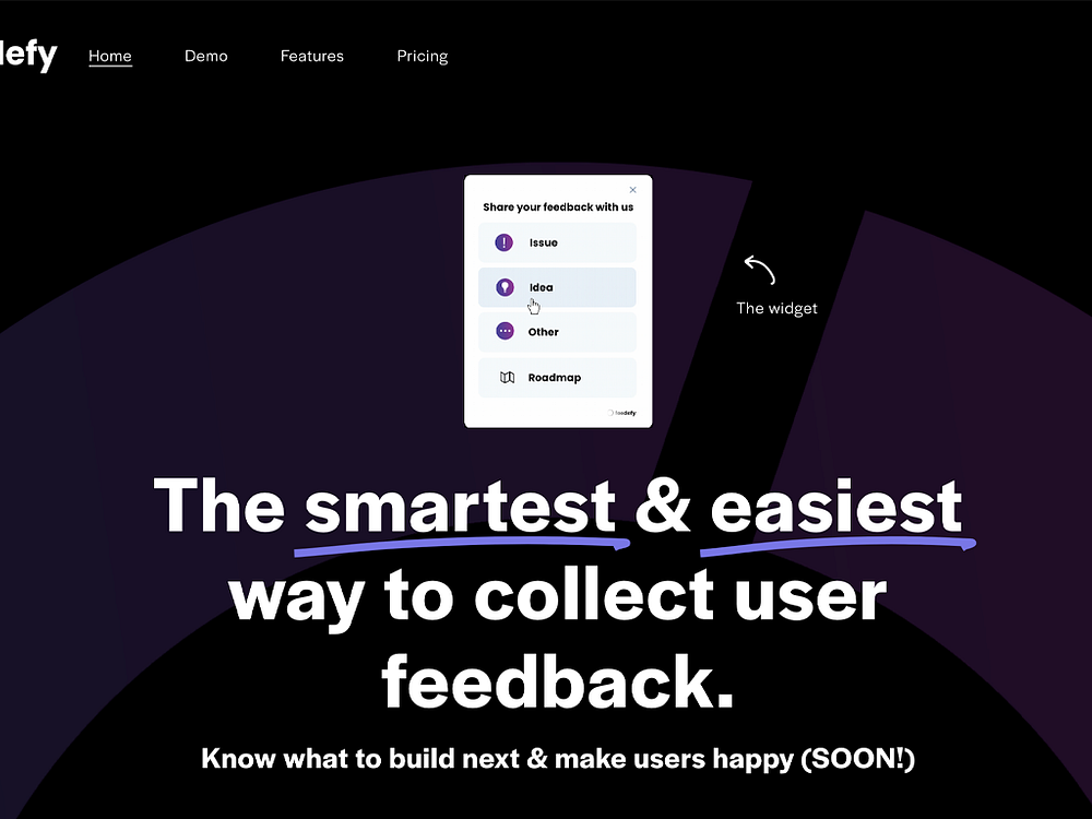 Feedefy is the easiest and smartest way to collect user feedback. You can install a straightforward feedback widget with a simple copy/paste code. You can collect bug reports (with auto screenshots), feature requests, or general feedback.