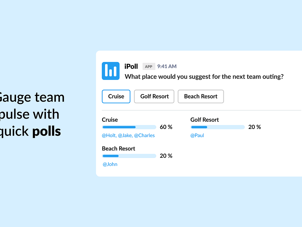 iPoll is your ultimate companion for your Slack workspace. Unlike conventional poll and form tools, iPoll is purpose-built to seamlessly integrate with Slack, ensuring that it complements your team's fast-paced, connected, and results-driven environment.