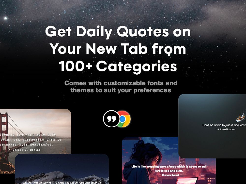 Featuring an extensive array of subjects including self-esteem, relationships, and stress management, the extension offers a variety of regularly updated, thoughtfully crafted themes to choose from. And with Motivation Quotes Tab Premium you can: + Unlock all themes + Unlock all fonts & typography settings + Unlock random themes rotation + Unlock all quotes from all categories + Design your own themes