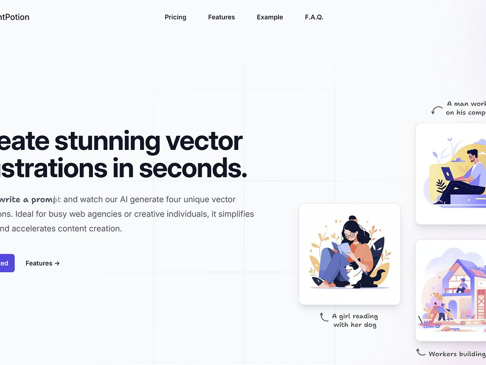 Paint Potion; Just type a prompt and our AI will generate four unique vector illustrations that maintain a consistent style. Perfect for busy web agencies and creative individuals, it simplifies and speeds up your design process.